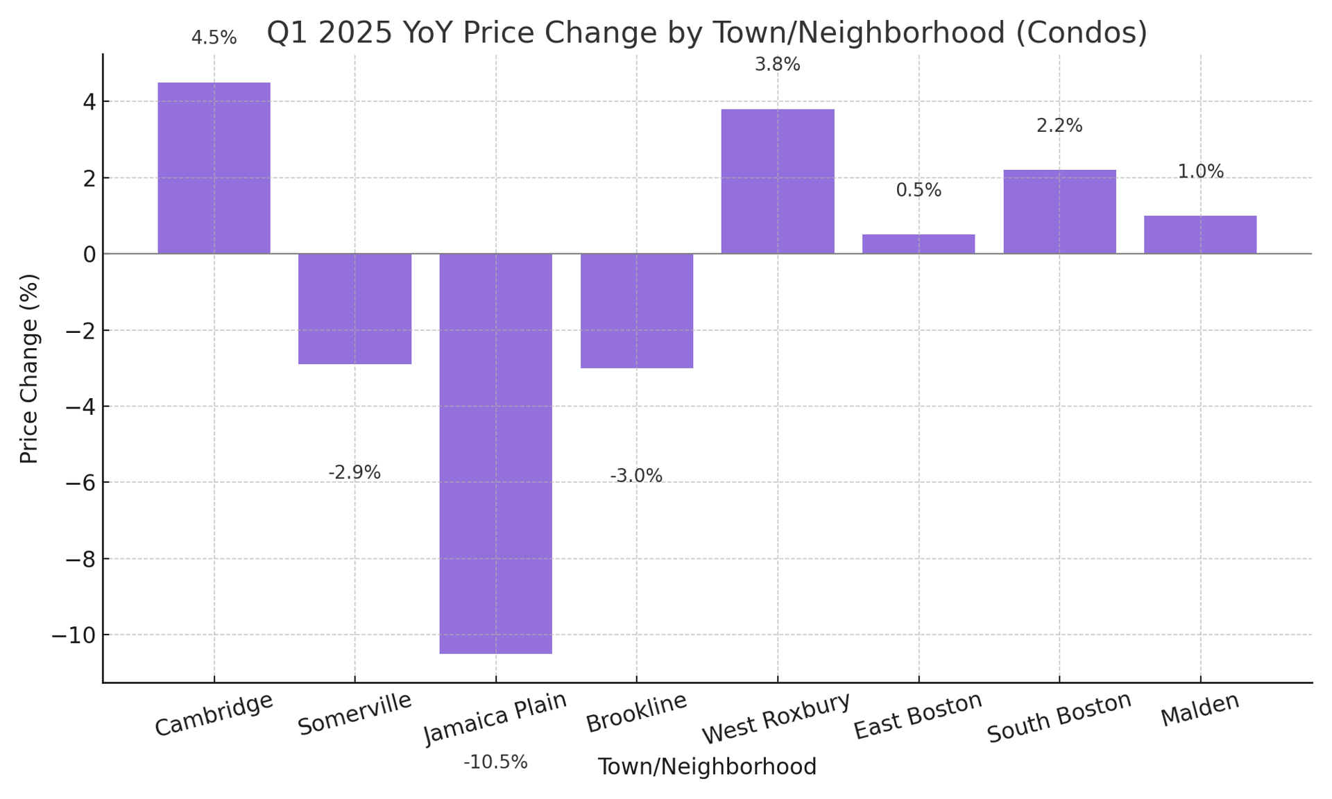 - Jamaica Plain Condos: Strong volume (+21.4%) but declining prices (−10.5%) and much slower market times suggest temporary buyer advantage or shifting demand patterns.