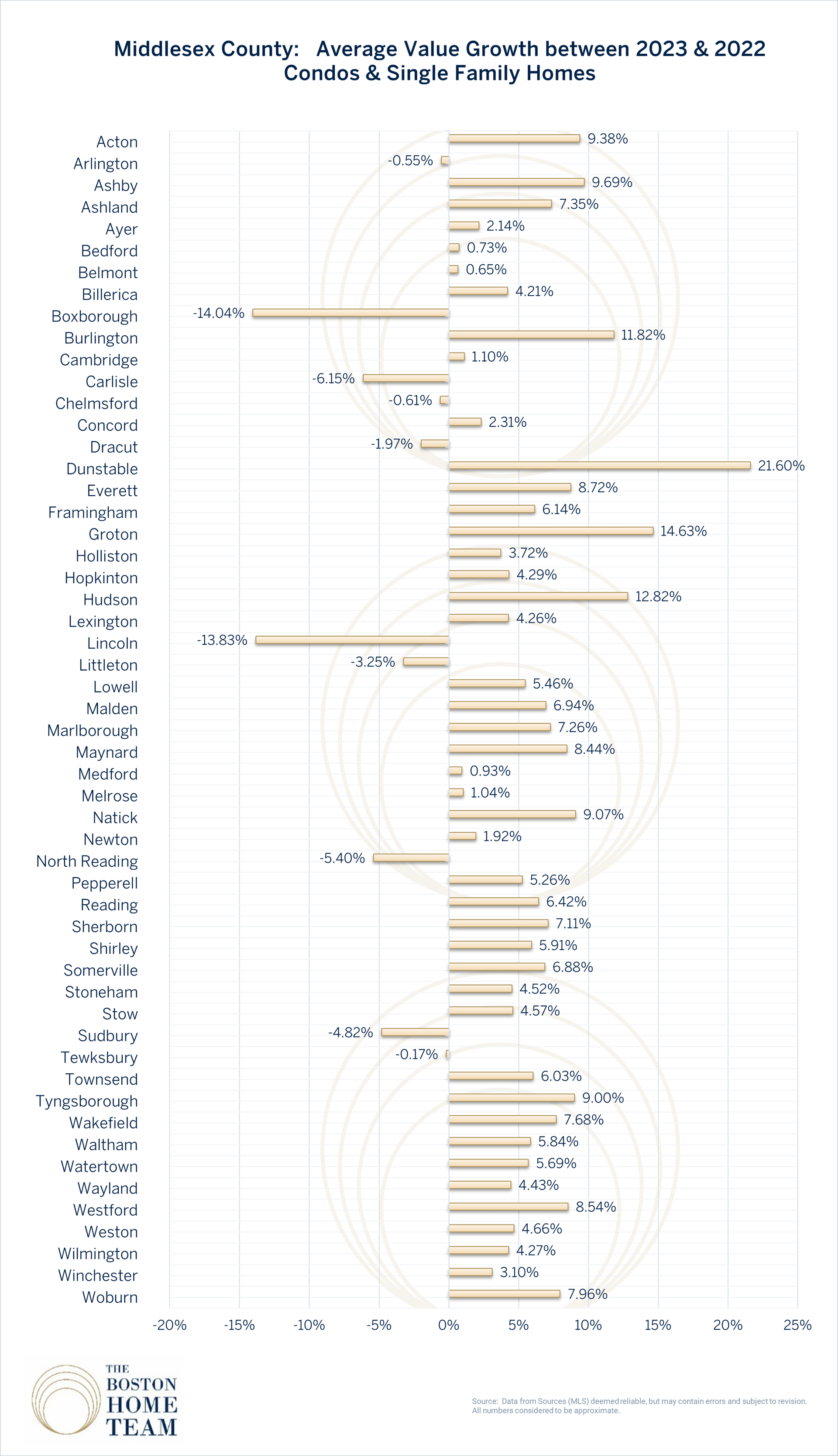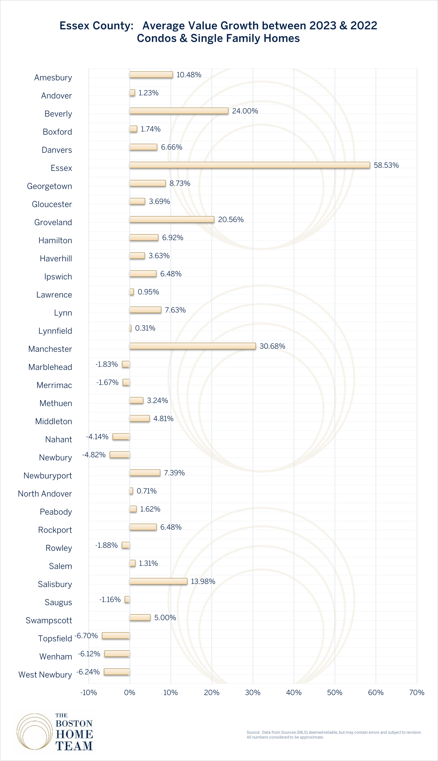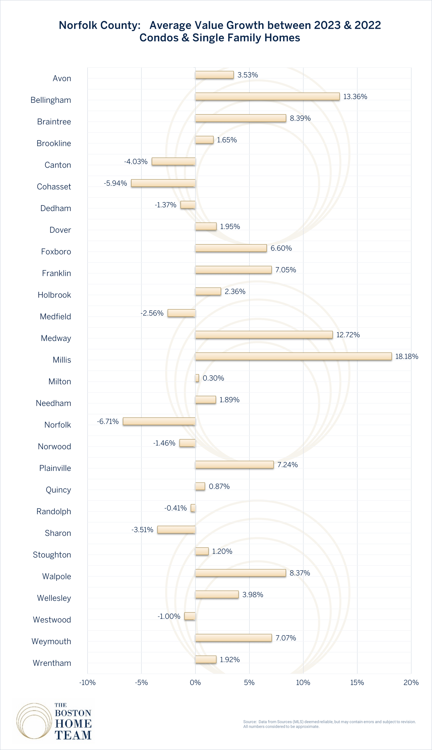 Average year over year value growth for single family and condominium homes by town/area in Essex, Middlesex, Norfolk, and Suffolk Counties. 2022-2023 edition.