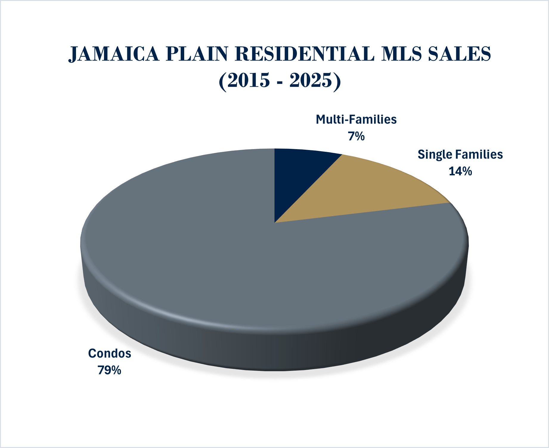 In JP the Real Estate inventory tends to be as diverse as its demographics. Between 2015 and 2025, roughly 14% of the residential properties sold were single family homes and nearly 80% were condos. JP condo values & its average price per square foot tends be close to the Boston's overall medians.